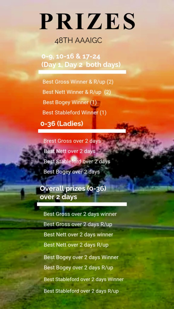 46th AAAIGC – Updated Prizes January 12, 2024 / sidman72 / Leave a comment 3 Prizes for the Professional Category – Best Gross over 2 days 1st Runner Up over 2 days 2nd Runner Up over 2 days